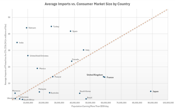 One capstone presentation examined international market development, asking a fundamental question: where can APG’s marketing efforts drive the most durable, long-term growth? Rather than attempting to analyze every variable, the group applied a disciplined, high-level framework—evaluating global markets based on consumer spending power and existing pistachio demand.